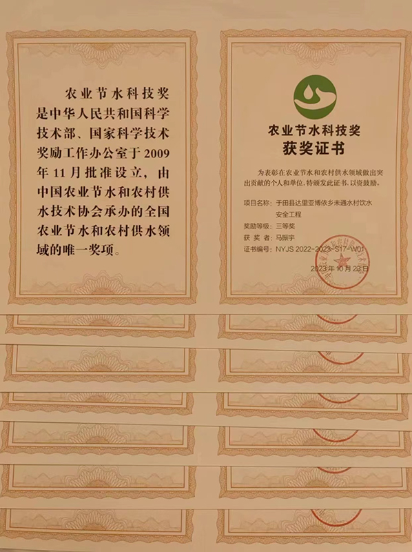 我院設(shè)計的“于田縣達理亞博依鄉(xiāng)未通水村飲水安全工程”,榮獲第九屆(2022-2023年度)農(nóng)業(yè)節(jié)水科技獎“大北農(nóng)杯”三等獎。項目設(shè)計人員馬振宇、董明田、郜曉輝、青海華、杜睿超、李金麗、張明玉榮獲個人三等獎。